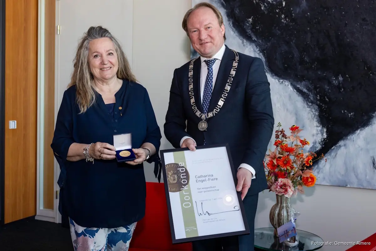 ALMERE - Burgemeester Hein van der Loo: "Carin Fiere laat zien wat één persoon kan betekenen voor een buurt. Haar inzet raakt mensen en maakt onze stad hechter. Deze erepenning is een verdiende erkenning voor haar blijvende bijdrage aan Almere."