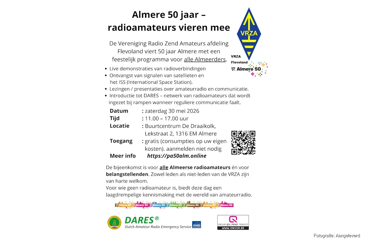 ALMERE - Almere bestaat 50 jaar – een mijlpaal die een jaar lang wordt gevierd met activiteiten door de hele stad, van Haven tot Hout en van Buiten tot Poort. Ook de radioamateurs van Almere doen enthousiast mee. De VRZA Afdeling Flevoland organiseert op zaterdag 30 mei 2026 een feestelijke dag