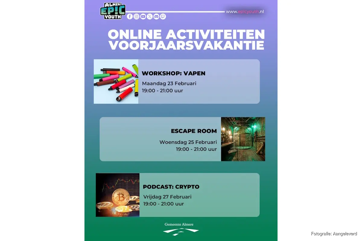ALMERE - Tijdens de voorjaarsvakantie organiseert Stichting Epic Youth in Almere diverse online activiteiten speciaal voor jongeren van 10 tot 25 jaar oud. Het voorjaarsvakantie programma staat in het teken van leerzame en leuke activiteiten. Deze activiteiten worden mede door jongeren zelf georganiseerd.