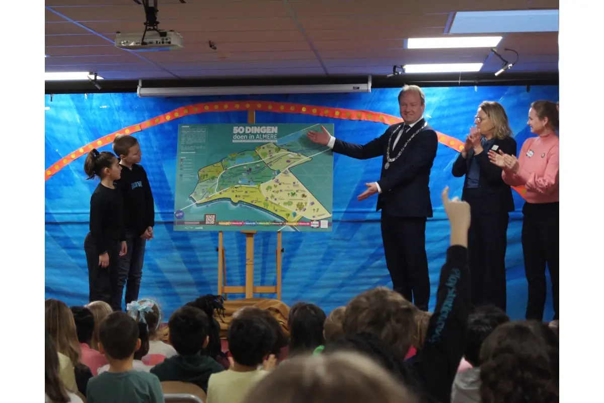 De kaart laat zien hoe rijk Almere is aan creatieve en groene activiteiten en nodigt scholen uit om met hun leerlingen op pad te gaan. De activiteiten sluiten aan bij thema’s als duurzaamheid, erfgoed, verbeelding en samen doen. In Almere valt op die gebieden veel te beleven, vaak dicht bij school en regelmatig gratis. Zo kunnen leerlingen van groep 1 tot en met 8 met school of met hun ouders struinen door de Oostvaardersplassen, kunst bekijken in KAF, street art spotten in Almere Buiten of brandnetelsoep maken in het Vroege Vogelbos. De burgemeester vroeg Adriana en Benjamin welke van de 50 activiteiten zij het liefste willen gaan doen. Adriana heeft als favoriet het maken van een gedicht. En Benjamin koos voor het maken van een spreekbeurt over Almere, de stad waar hij woont.